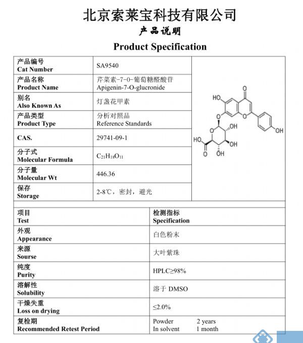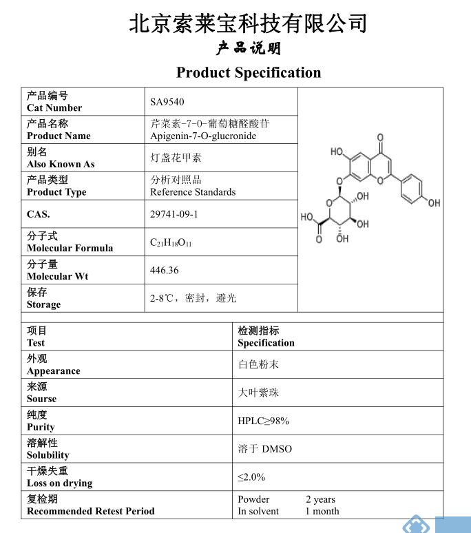 产品名称: Apigenin-7-O-glucronide;芹菜素-7-O-葡萄糖醛酸苷